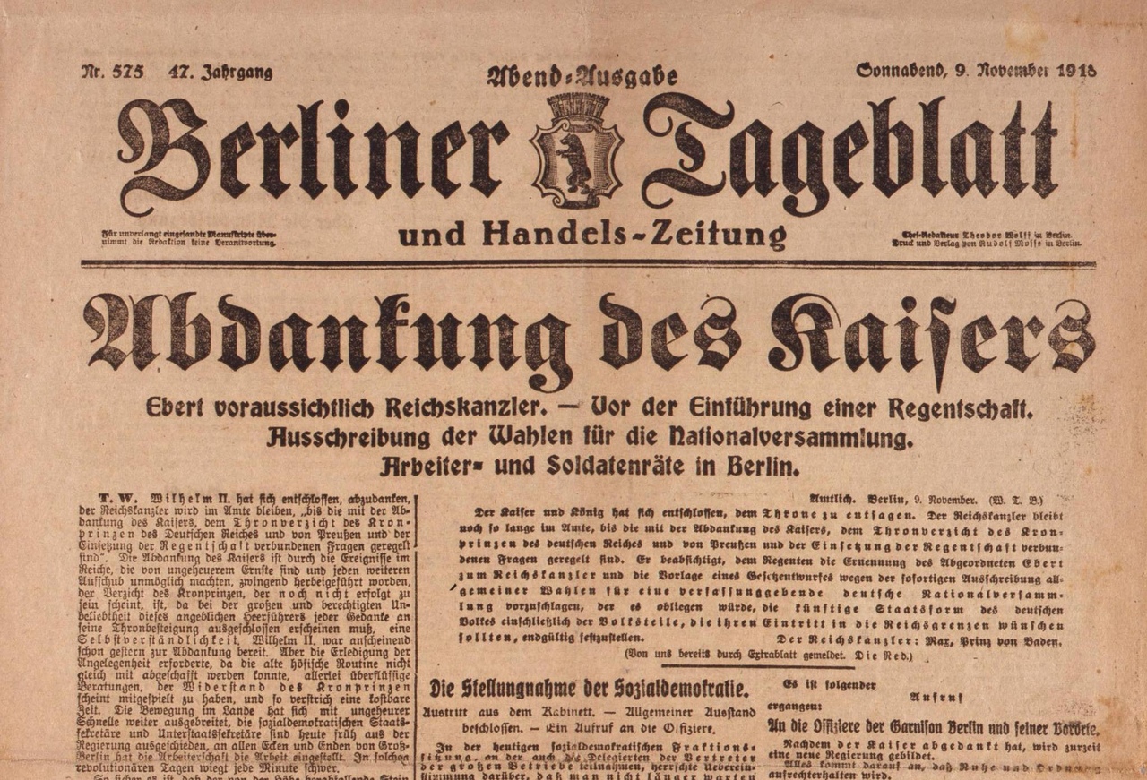 „Abdankung des Kaisers.“ titelte das Berliner Tageblatt am 9. November 1918. Heute, ziemlich auf den Tag genau 100 Jahre später, würde man eine derartige Nachricht als Fake News bezeichnen, denn zum einen erfolgte das, was als Abdankung bekannt ist, tatsächlich erst am 28. November 1918. Zum anderen, und das ist wesentlich dramatischer, ist eine Abdankung des Kaisers in der Verfassung des Deutschen Reiches nicht vorgesehen. Damit der Kaiser abdankt, muss der König von Preußen abdanken. Zur formellen Abdankung des Königs von Preußen bedarf es aber eines Regierungsaktes. Wie erlangt ein Regierungsakt Gültigkeit? Dazu sagt die Verfassung Preußens folgendes: „Artikel 44. Die Minister des Königs sind verantwortlich. Alle Regierungsakte des Königs bedürfen zu ihrer Gültigkeit der Gegenzeichnung eines Ministers, welcher dadurch die Verantwortlichkeit übernimmt.“