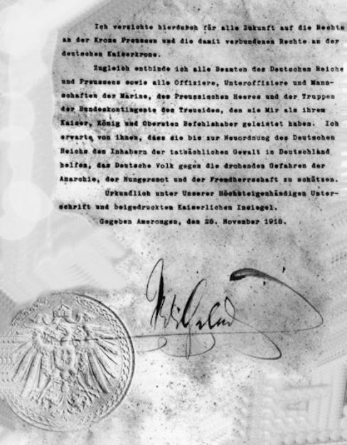Die folgende Schrifstück belegt eindrucksvolln, daß Kaiser Wilhelm II. nicht aus freiem Willen und/ oder eigenem Antrieb auf die Krone verzichtet hat: