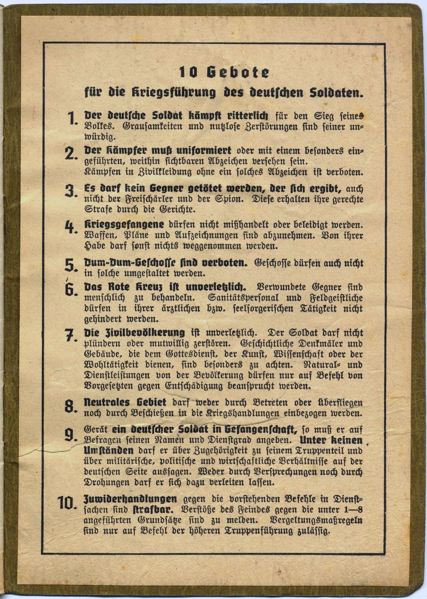 Von solchen Details der Geschichte lernen Deutsche nichts, denn es passt nicht in das offizielle Bild der menschenfressenden Deutschen. Nicht ohne Grund wurden bei der Gefangennahme eines deutschen Soldaten im sog. zweiten Weltkrieg als erstes die Seite mit den „10 Gebote für die Kriegführung des deutschen Soldaten“ von den Alliierten aus dem Soldbuch des Deutschen entfernt: Es würde nicht in das Bild passen, dass die Greuelpropaganda von den Deutschen verbreitet: Deutsche Humanität? Im Krieg? Unmöglich!