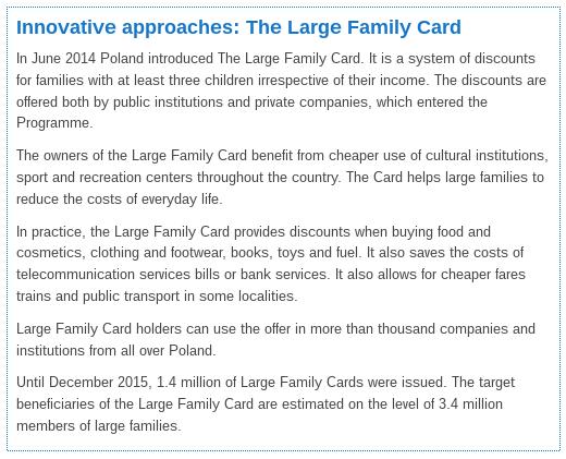 Ein besonderer Bestandteil des Programms: Die „Large Family Card„, die 2014 eingeführt wurde und Familien ab dem dritten Kind Sofortrabatte beim Einkauf von zB Lebensmitteln, Schulsachen und Bekleidung sowie vergünstigte Tarife im ÖPNV und vieles mehr gewährt. Im Dezember 2015 waren bereits 1,4 Millionen Karten ausgegeben, als Ziel wird die Ausgabe von 3,5 Millionen Karten genannt – das entspricht 3,5 Millionen Familien á mindestens 3 Kinder, es sollen also 10,5 Millionen polnische Kinder in der nächsten Zeit geboren werden.